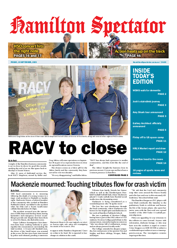 Hamilton Spectator – 19th September 2025 Subscribe or Login to see the rest of the content. Username Password * Remember Me Forgot Password News Wet, wild, and windy Wednesday 23/10/2025 IT seems like deja vu as another spell of wild weather hit the region on Wednesday, just over two months out from the late... Medal magic at nationals 23/10/2025 Four local competitors from Palace Martial Arts recently returned from the Australian Taekwondo National Championships with great success. Steph Farquharson won a bronze medal in... Screening saves lives 23/10/2025 October is Breast Cancer Awareness Month — a time to shine a light on the importance of screening and early detection, in the fight...
