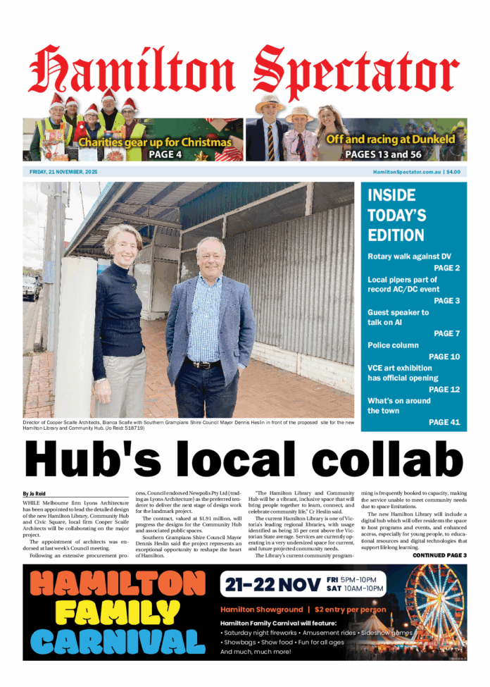 Hamilton Spectator – 21st November 2025 Subscribe or Login to see the rest of the content. Username Password * Remember Me Forgot Password News Hamilton Table Tennis 20/11/2025 A GRADE Falcons vs Magpies Aaron Rowbottom (Falcons) easily won both singles — a straight win vs Caleb Gellert (Magpies) and dropping one game against fill-in... Blues looking to bring the heat 20/11/2025 A win for Pigeon Ponds' D grade side tomorrow against Hamilton in the HDCA could help them shoot up the ladder, and if the... Author’s talk on Weary draws energetic crowd 20/11/2025 Nearly 200 people attended a talk and book signing on Tuesday night at the PAC by author and journalist Peter FitzSimons, where he shared...