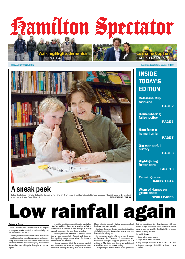 Hamilton Spectator – 3rd October 2025 Subscribe or Login to see the rest of the content. Username Password * Remember Me Forgot Password News Wet, wild, and windy Wednesday 23/10/2025 IT seems like deja vu as another spell of wild weather hit the region on Wednesday, just over two months out from the late... Medal magic at nationals 23/10/2025 Four local competitors from Palace Martial Arts recently returned from the Australian Taekwondo National Championships with great success. Steph Farquharson won a bronze medal in... Screening saves lives 23/10/2025 October is Breast Cancer Awareness Month — a time to shine a light on the importance of screening and early detection, in the fight...
