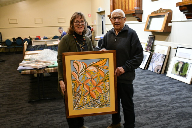 Mari Alexander and rotarian James Dunn with Mari's artwork titled Gumnut blossom awaking. (Ciaran Thow: 508474)