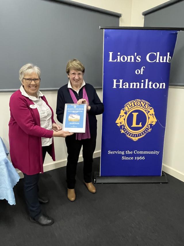 Shirley Menz, Lions District Vice Governor, presents volunteer Heather Kruger with her award.