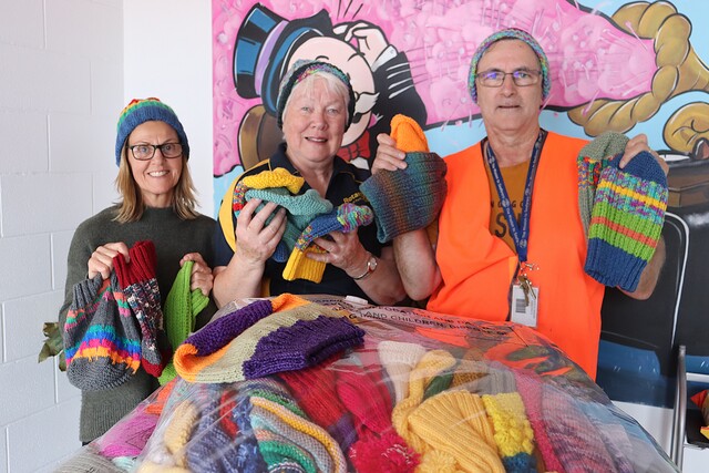 Portland Seaview Real Estate Kylie Kane, Rotary Club of Portland Erin Barker and Portland Mission to Seafarers Neville Manson with the hundreds of beanies collected this year. (Charlie Sawyer-Bassett; 514079)