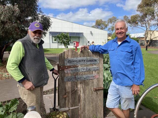 Community Garden volunteer Bill Coe with former local Glen Herring, catching up over the garden gate. (Jo Reid: 513548)