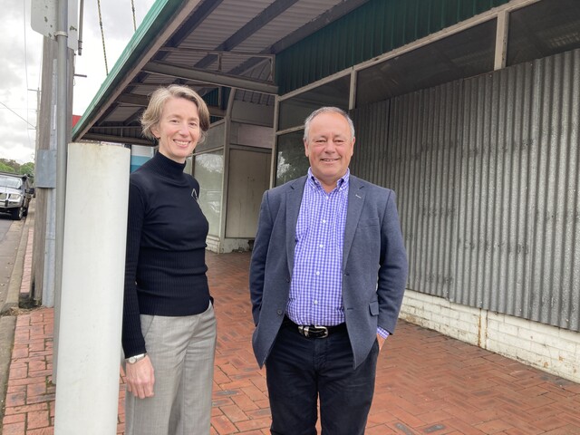 Director of Cooper Scaife Architects, Bianca Scaife with Southern Grampians Shire Council Mayor Dennis Heslin in front of the proposed site for the new Hamilton Library and Community Hub. (Jo Reid: 518719)