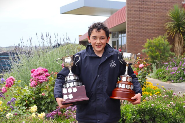 Winner of this year's Hamilton & District Legacy Junior Public Speaking competition Year 9 student Ajay Sonti, 15, holding both the Legacy Junior Public Speaking National and State trophies after his speaking success. (Charlie Sawyer-Bassett; 518919)