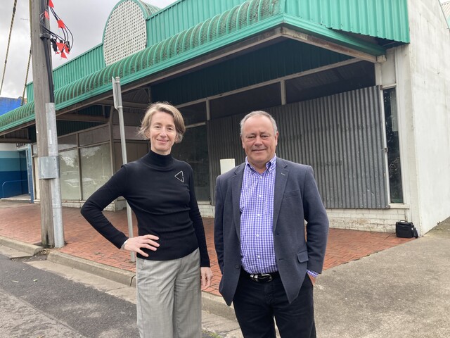Bianca Scaife of collaborating architecture firm Cooper Scaife Architects and SGSC Mayor Dennis Heslin in front of the old Walker's Building which is set to be demolished next month to make way for the new Community Hub.